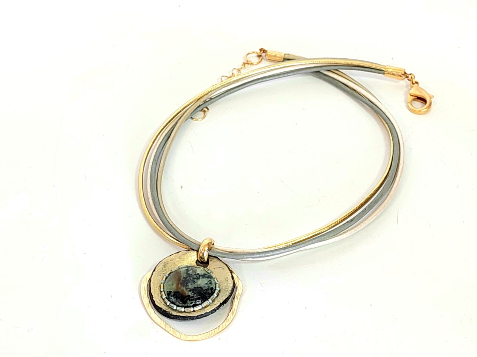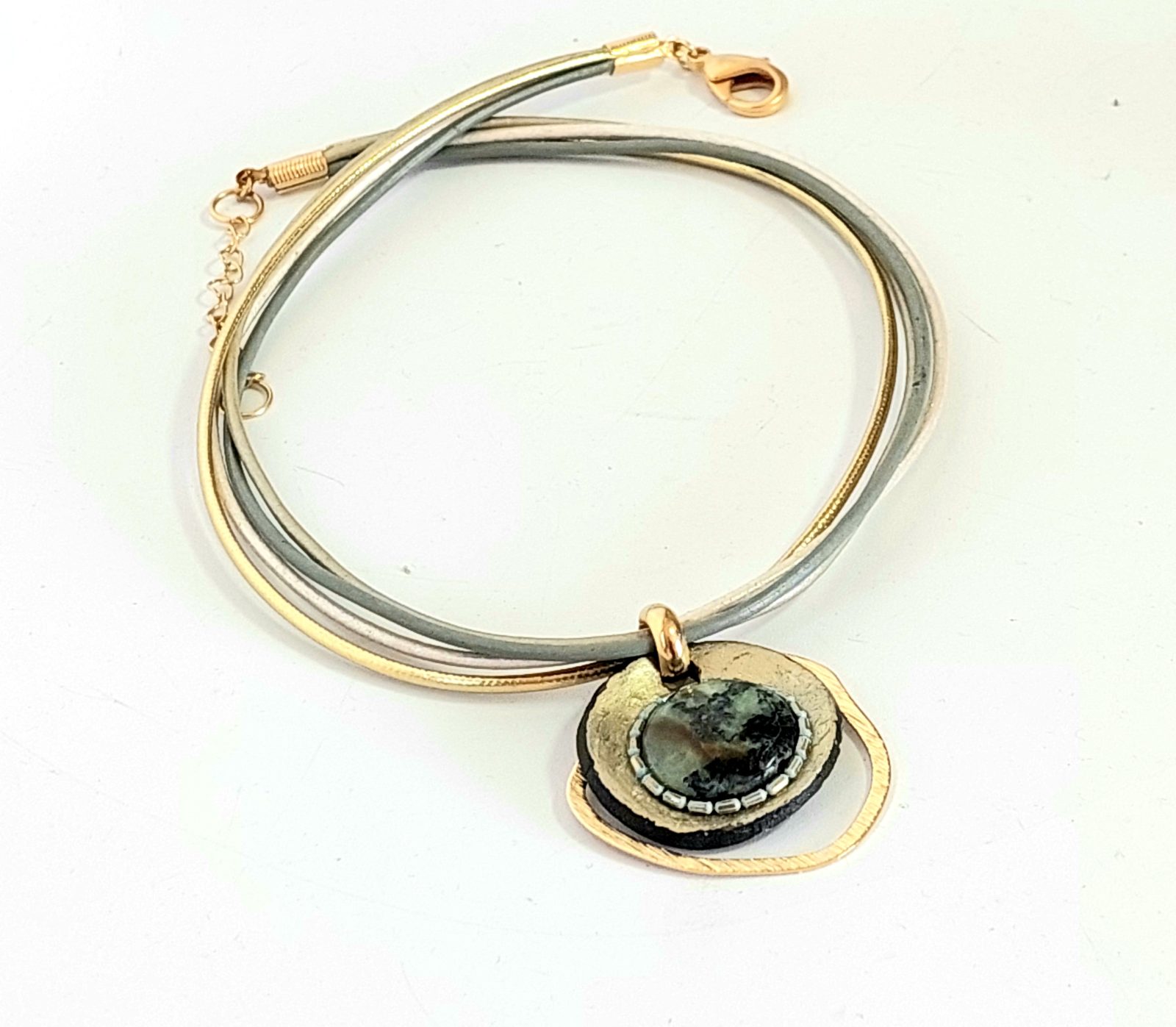 שילוב חלקי פיוטר בציפוי זהב 24K כל זאת בשילוב עורות וחוטים בגווני אפור וזהב.